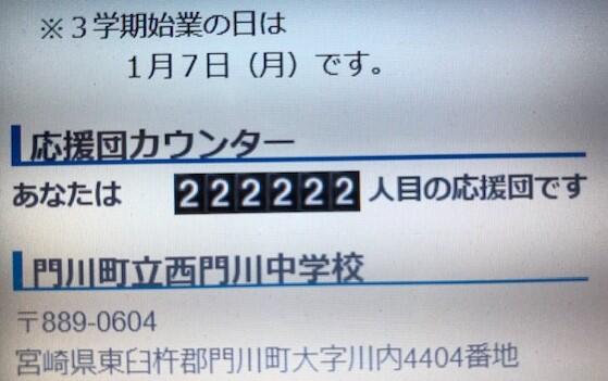 昨晩、このホームページの「応援団カウンター」を見たところ、偶然にも「2」が6つ並んでいましたので画面の写真を撮りました。多くの皆さまに閲覧していただき感謝しております。冬休みに入っているため、しばらくは更新することが少ないと思いますが、3学期も学校や子どもたちのようすを掲載していきますので、西門川中学校への「応援」をお願いいたします。