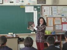 今日は、移動図書館の日。昼休みになると、小学生がたくさん中学校の図書室にやってきます。毎回、町立図書館からたくさんの本を持ってきてもらっています。