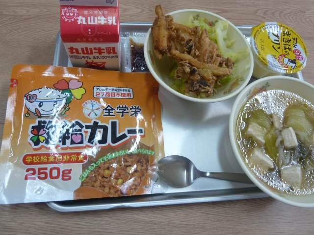 今日の給食は、学校給食用非常食「救給カレー」です。
