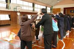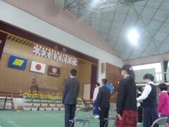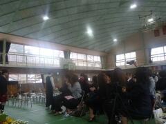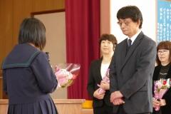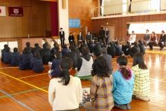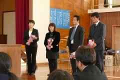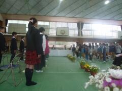 転出される先生方4名とのお別れの日。職員室で職員とのお別れの会を行った後、体育館で子どもたちとのお別れの式を行いました。先日卒業した卒業生を含め殆どの生徒が参加しました。また、保護者や地域の方も参加され、涙の離任式でした。