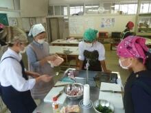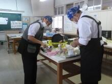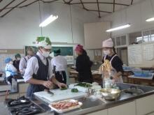 5・6校時に、1年生の調理実習(家庭科)が行われました。メニューは「豚肉のしょうが焼き」と「ほうれん草のおひたし」。グループごとに別れて、計画に従って、