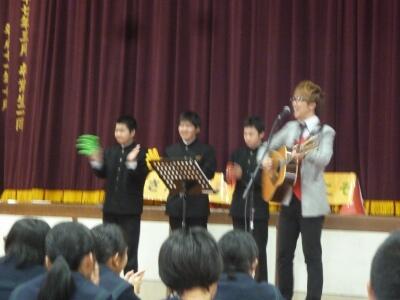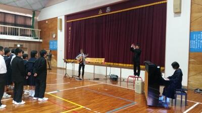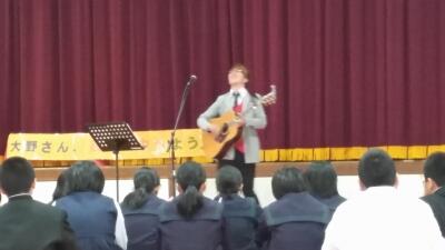 昨日の6校時に「鑑賞教室Ⅱ」を実施しました。西諸県(高原町)出身、現在東京を拠点にシンガーソングライターとして活躍している 大野勇太さんに来ていただき、