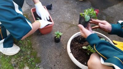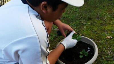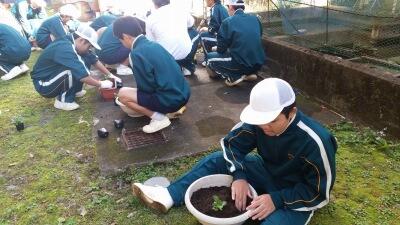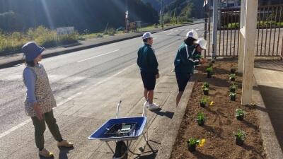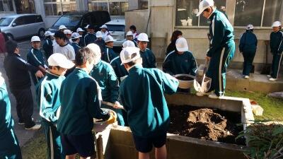 5校時に第4回花壇学習を行いました。花の苗植え。全員でプランターや鉢に土を入れ、苗を植えます。その後、学年の花壇、正門前花壇、郵便局前に別れて各場所に植えました。