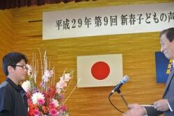 西門川中学校からは、2年生の川内田 響さんが「門川町の未来」というテーマで学校で取り組んでいる防災学習や昨年9月の台風による浸水被害をとおして考えたことをのべてくれました。また、西門川小学校の松田 悠汰くんは、「ふるさと門川町とぼくの夢」というテーマでお父さんの仕事を通して学んだことや門川町の観光に係るアイデアを述べていました。