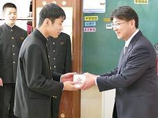 門川町商工会と県北法人会門川支部の皆様が、高校入試を目前に控えた3年生に「落ちないりんご」を贈呈してくださいました。この「落ちないリンゴ」は、1991年9月に青森県を襲った台風による暴風雨に耐え抜いたリンゴを合格祈願の縁起物として商品化されたもので、8年前から贈呈していただいています。