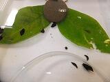 そのため水をはったバットにカワニナ、カワニナのえさになるイヌビワ(クワ科イチジク属の落葉小高木)の葉を入れて飼育しています。