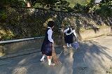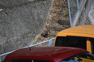 4校時が終わった頃、「タヌキが来ている」と報告を受け見に行ってみると、学校北側の山の階段下にタヌキがいました。「日向ぼっこに来たのかな」と思い様子を見ていましたら、学校横のお寺のほうに向かって歩き始めました。後ろ足の上のお尻辺りに赤い傷みたいなものが見え、怪我をしているようでした。山に帰り、早く傷が癒えてくれるといいのですが。