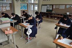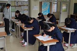 本日より、3年生の地区実力テストが始まりました。実力テストは今年になって3回目となります。1月下旬の私立高校入試、2月4日の県立高校推薦入学者選抜検査、3月4日・5日の県立高校一般入学者選抜学力検査の際に、生徒の日ごろの実力が十分発揮できればよいなと思っています。がんばれ3年生。