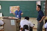 7月に前任のALTの先生が帰国されたので、9月26日(金)に後任のアメリカ合衆国出身の先生が来られました。本校での授業は初めてだったので、自己紹介をされていました。出身地、好きな食べ物、趣味、年齢、好きな動物、兄弟の人数についてクイズ形式で自己紹介をされました。クイズに正解した生徒には、シールを配っていただき生徒たちは大喜びでした。これから、毎月1日来校されて指導していただきます。よろしくお願いします。