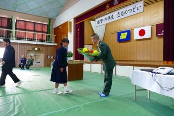 式典では、新原教育長が、「地域に誇りをもってください。汗水流して働いている大人を見て、中学生にできること、