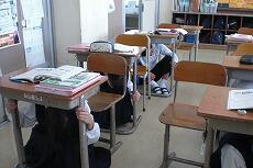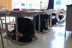 大規模地震を想定した県民一斉の防災行動訓練「みやざきシェークアウト」が実施され、西門川中も訓練に参加しました。午前10時に「大きな揺れが発生した」と放送が入ると、子どもたちは一斉に机の下に潜り込みました。「自分の命は自分で守る」ためにも、訓練は大切なものです。5月10日(金曜日)に発生したマグニチュード6.3の地震の時、子どもたちはすぐに机の下に潜り込みました。
