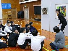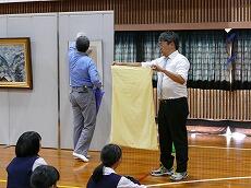 県立美術館による移動鑑賞教室を行いました。前半は県立美術館や所蔵作品の紹介、後半は4点の”本物”の所蔵作品をわかりやすく紹介していただきながら鑑賞しました。鑑賞の仕方や絵の特徴などを子どもたちとのコミュニケーションを通して楽しく説明してくださり、あっという間に時間が過ぎました。また、鑑賞の前には、手袋や服装などに気をつけながら、作品をていねいに展示するようすも実際に見せてくださいました。