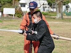 後半は、日向市消防本部の方々による火災予防に関する講話と水消火器の使い方説明、代表生徒による体験、消防車からの放水体験をしていただきました。講話では、各家庭で設置が義務化されている「火災報知器」の説明や、学校で出火した際の私たち職員がとるべき行動についても話してくださいました。