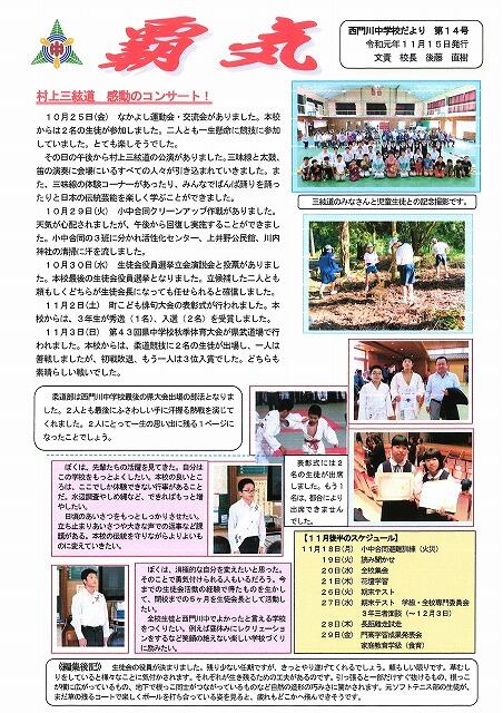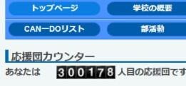さて、今月の行事を修正しようとホームページを開いたところいつの間にか応援団カウンターが30万を超えていました(令和元年12月1日19時30分現在300,178人)。閲覧していただきありがとうございます。これからも西門川中学校や生徒のようすを発信していきます。
