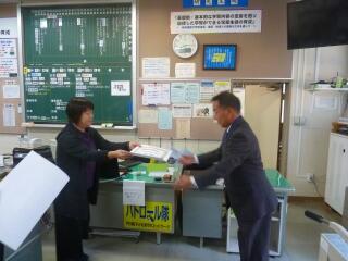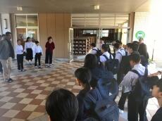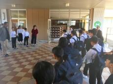 門川中に到着すると生徒玄関前で先生が待っていてくださいました。あいさつを済ませ