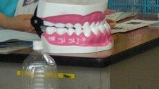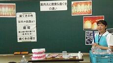 最初に虫歯や歯周病について話をしていただき、続けて正しい歯のみがき方(ブラッシング)を教えていただきました。子どもたちは給食の後は必ず歯を磨いています。今日のブラッシング指導は5時間目だったので、「染色液」を使い、歯の磨き残しを調べたところ、やはり「磨き残し」がありました。正しいブラッシングを身に付けて「8020」や「6024」を目指してほしいと思います。