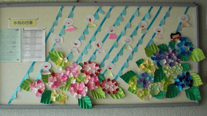 登校する子どもたちや学校のお客様をお迎えする玄関の掲示物が今月も替わりました。今月は梅雨やあじさいを題材とした掲示になっています。
