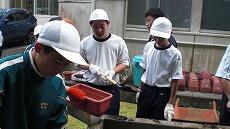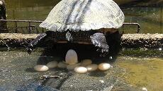 有精卵か無精卵かはまだ分かりませんが、ミドリガメの正式名は「ミシシッピーアカミミガメ」で、要注意外来生物なので川に放すことはできません。西門川中学校は来年3月で閉校します。池にいる金魚(形はフナに近い)、鯉(20cm位)、カメをもらってくださる方がいらっしゃいましたらご連絡ください。