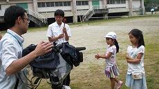 5月中旬からテニスコート横のセンダンの木に「アオバズク」が来ています。今日はケーブルメディアワイワイが取材に来られました。撮影は昼休みだったので、運動場で遊んでいた小学生にも声をかけ、センダンの木の下に集まってもらいました。代表で、中学生が一人、小学生が二人インタビューを受けていました(インタビューをしているのは、職場体験学習中の門川中の生徒です)。
