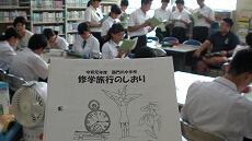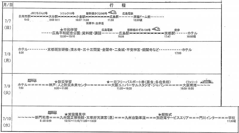 いよいよ明日から修学旅行です。校長先生を団長として、全校生徒(2年生と3年生)と引率職員とで3泊4日の旅が始まります。明日は午前6時に日向市駅に集合し、結団式を行い、JRを利用して広島、京都へと向かいます。朝が早いので、今夜は早めに寝ることでしょう。