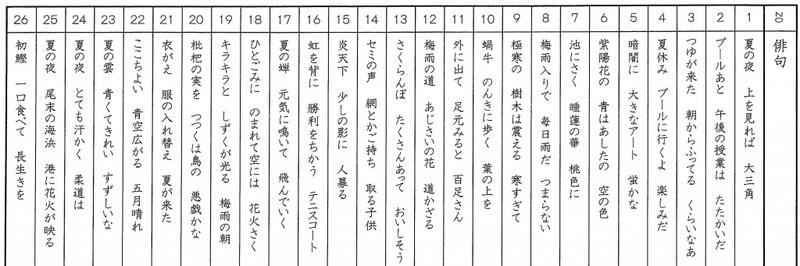 西門川中では毎年この時期に「門川町俳句の会」の皆さまに学校に来ていただいて「俳句の授業」を行っています。今日は3名の”先生”に授業をしていただきました。授業では、事前につくっておいたそれぞれの句から、自分が一番よいと思う句を選び(選句)ました。その後”先生”がそれぞれの句の批評をしてくださいました。中には修正が入らないよい作品もありました。