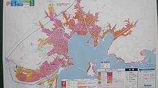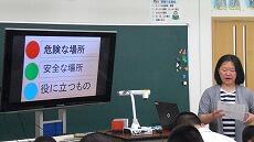 はじめにDVDを見て津波や豪雨による河川の氾濫、土砂災害について学習しました。その後、担当の先生が門川町の浸水マップや土砂災害危険区域を大まかに示し、自分たちが住んでいる危険な場所を調べ、それを書いた付箋を地図に貼り付けていきました。