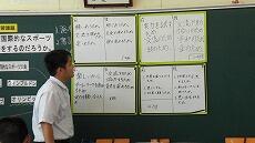 今日は3年生の保健体育の授業で研究授業を行いました。今日の研究授業は日向地区の中学校の体育科の研究授業も兼ねていたので他校の先生方も見に来られました。授業に向けて準備もしっかりされていたので、「オリンピックなどの国際的な大会の役割」について子どもたちはよく考え、班での話し合い頑張っていました。