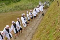 今回、41年ぶりに門川町の担当となり、本校の生徒も西門川小の児童と一緒に参加することになり、本日、無事に「御田植祭」を終えることができました。昨日から天候を心配していましたが、今日は曇。田植えの後半では時折、陽もさしてきました。