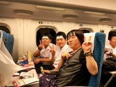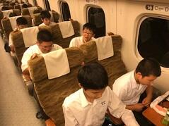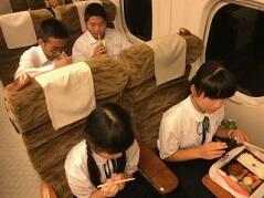 修学旅行生は広島平和記念公園での見学や講話を終え、新幹線で京都に向かっています。写真は新幹線の中でおやつを食べているときの様子です。写真を見ると額に冷却シートを貼っている子どもがいます。みんな笑顔なので、元気そうではありますが、どうしたのでしょう。ホテル到着後、学校に電話連絡が入るので、その時に聞いておきます。