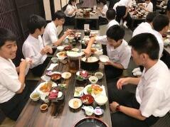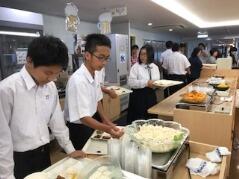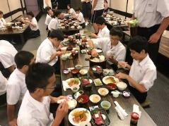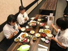 3枚目の写真は食事後のテーブルの様子です。テーブルごとに食器をまとめ、片付けやすくしておきます。部活動の遠征や合宿などを行う部活動生は、あたり前のこととして身に付けていることです。