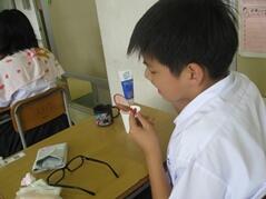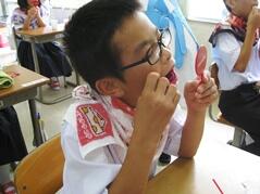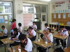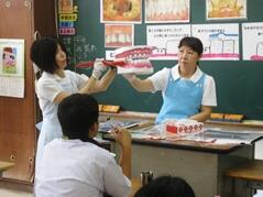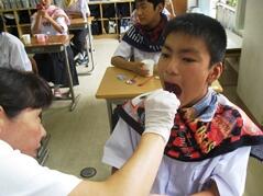 今日の4時間目、歯科衛生士の方に来ていただいて「ブラッシング指導」を行いました。はじめに磨き残しを調べる薬品を塗り、自分でチェックしました。次に正しい磨き方の説明を受けてから実際に歯を磨きました。西門中では、給食後子どもたちは全員歯を磨いています。正しいブラッシングの仕方を身に付けて、「8020」を目指してほしいものです。
