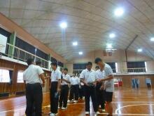 赤団、白団、体育館でリーダーの指導の下、熱心に練習に励んでいました。