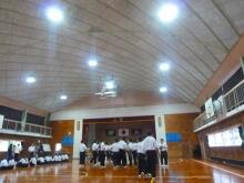先週の予行練習の反省から、今日は入場行進や国歌、団技の入退場の仕方などを練習する予定でしたが、あいにくの雨のため運動場が使えず、体育館で練習しました。