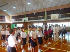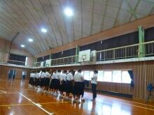 先週の予行練習の反省から、今日は入場行進や国歌、団技の入退場の仕方などを練習する予定でしたが、あいにくの雨のため運動場が使えず、体育館で練習しました。
