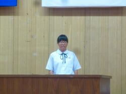 「生徒会からの言葉」は今月の取組を生徒会副会長が説明しました。また「1分間スピーチ」の担当は1年生で、テーマは「運動会に向けて」でした。子どもたちは自分が発表することを覚えて、原稿を見ることなく発表していました。