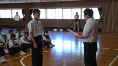 地区中学校総合体育大会が終わり、学校で表彰を行いました。