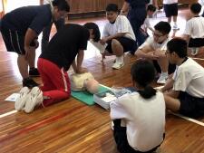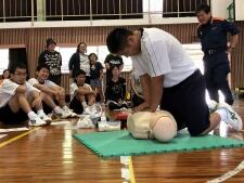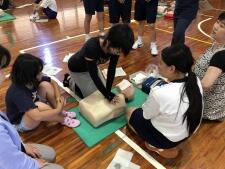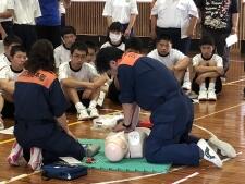 西門川小学校は明日から、西門川中学校は来週から水泳の授業が始まります。今日は救急救命法として、日向市消防本部警防課より2名の方を講師として迎え、心肺蘇生・AED講習を行いました。受講したのは、本校の生徒の他に、小学校と中学校の職員、そして家庭教育学級の保護者です。