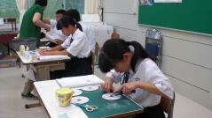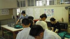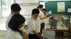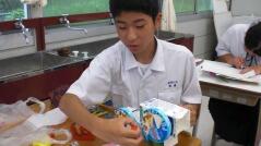 2年生の技術・家庭科(家庭分野)では、「家族・家庭と子どもの成長」という単元を学習しています。今日は身近にある牛乳パックやCDなどを使い、幼児と遊ぶためのおもちゃづくりをしていました。子どもたちは材料や形、組み立て方などをそれぞれ工夫して作っていました。このおもちゃは、夏休みに実際に幼児と遊び使うことになるそうです(一緒に遊ぶことが夏休みの宿題でしょうか?)。