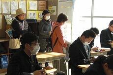 今日と明日は3年生が実力テストを受けています。高校入試に向けた最後の実力テストです。3年生の教室には勉強や入試に向けた本が置いてあります。また、教室後方には、「全員合格」と書いた模造紙も掲示してあります。この模造紙は10年近く掲示してある代々3年生を見守ってきてくれたものです。