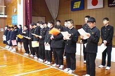 3学期が今日から始まりました。始業式では代表生徒2名が学習面や生活面について新年の抱負を発表しました。3月末で西門川中学校は閉校するため、2年生は4月から門川中学校の3年生になります。そのことを考えながら部活動の目標も発表しました。3年生は高校入試が控えているので「志望校合格」のためにすることを具体的に発表していました。