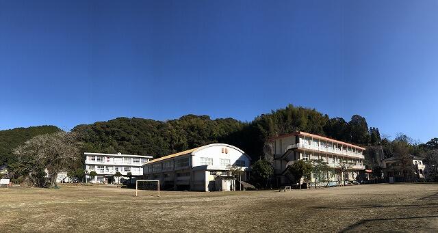 運動場から見た体育館と中学校と小学校の校舎です。今朝は快晴でした。