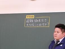 西門川中学校では、年間5回の防災学習を行っています。今日はその4回目で、防災士の資格をもつ先生が「避難時の生活」をテーマに授業を行いました。今回は生徒全員に長期保存が可能な非常食(パンとにぎり)と飲料水を非常持出袋に入れて配付し、自宅に持ち帰らせました(パンは缶に入っていて、5年間保存可能。おにぎりは水を入れるだけで食べることができ、3年間保存可能)。