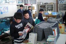 西門川中学校には2週間ごとに、軽貨物車に町立図書館の本と図書館司書を乗せた「移動図書館」がやってきます。昼休みに小学生と中学生が借りた本を返却し、次の本を借りていきます。10年以上前から続いているものですが、3月末の閉校により、子どもたちが本を借りるのは今日が最後となりました。これまでの感謝の気持ちを生徒会学習委員長が生徒を代表して伝えました。(次回3月5日に来校されますが、このときは返却した本を回収するだけです)。