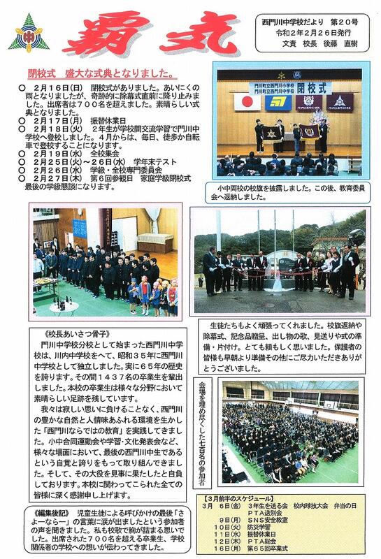 2月16日(日曜日)に実施しました「閉校記念式典」の記事が、今日の宮崎日日新聞の県北のページ(14面)に掲載されています。記事の中に児童生徒が学校での思い出や地域への感謝を伝えた「閉校のことば」の中の「さようなら、私たちの西門川小学校。ありがとう私たちの西門川中学校」を読み、当日集まってくださった方々の顔を思い出しました。