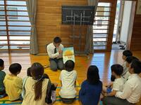 後半は、学習委員による読み聞かせを行いました。幼稚園生から9年生の縦割り班(ファミリー班)ごとに読み聞かせを行い、どの班も本の世界にどっぷりと浸っていました。