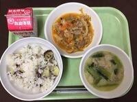 今日は美郷の日給食です。美郷町で作られた食べ物をたくさん使った「秋野菜の煮物」です。美郷町で作られたしいたけ、西郷で育てられたじとっこと栗を使いました。また、和え物には、秋が旬の柿を使った「柿なます」を作りました。秋に一番おいしく食べられる旬の食べ物をたくさん使った美郷の日のメニューです。急に寒くなったので体調管理に気を付けて沢山食べてほしいと願っています。
