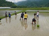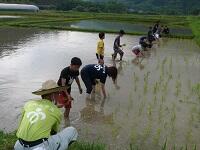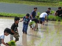 5年生が6月10日(木)に、美郷科学習で、田植え体験学習をしました。ひもの線と点に沿って苗を植えましたが、なかなか真っ直ぐには植えられませんでした。しかし、児童はとても楽しそうに学習していました。中には、泥がいっぱい洋服について、片付けで洗うのが大変そうでした。