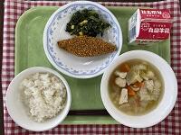 麦ご飯 だご汁 魚のもみじ焼き たくあん和え 牛乳