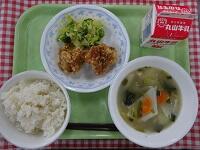 鶏天ご飯 わかめスープ りっちゃんサラダ 牛乳