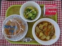 今日のパンは、給食では珍しい「クロワッサン」でした。「クロワッサン」は、バターを練り込んで焼いているので、バターの風味が特徴のパンです。形から、フランス語で「三日月」という意味の名前がつけられたそうです。子どもたちも珍しがって食べていました。